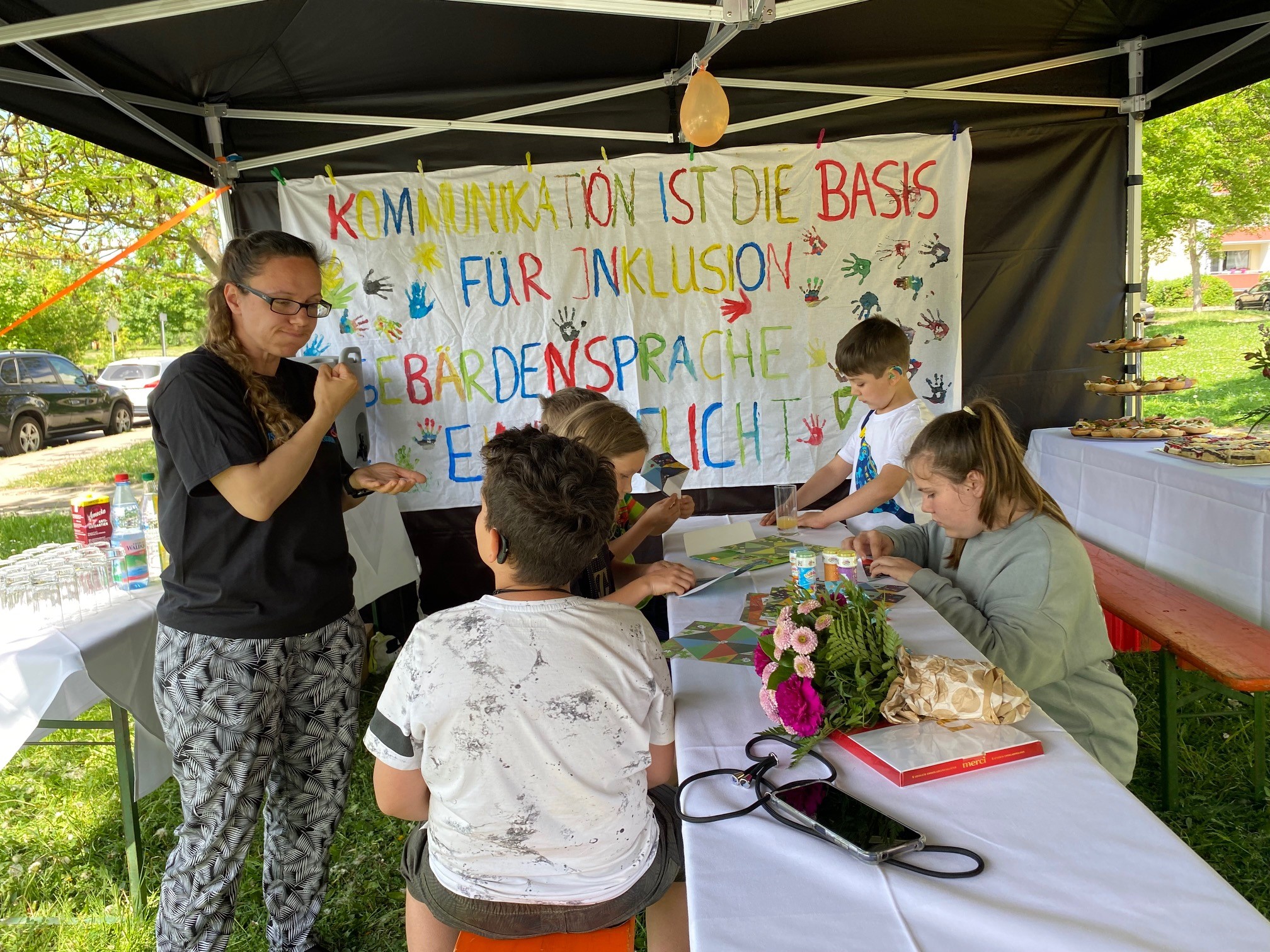Bei tollem Wetter konnten die Kinder draußen spielen und basteln, wir lernten persönlich Frau Franz kennen, die neue Vertreterin der evangelischen Kirche Mitteldeutschland als Ansprechpartnerin für Gehörlose, führten interessante Gespräche mit Frau Grassow und Frau Frind von der LIGA Selbstvertretung Thüringen. Auch unter den Gästen wurden neue Kontakte geknüpft.