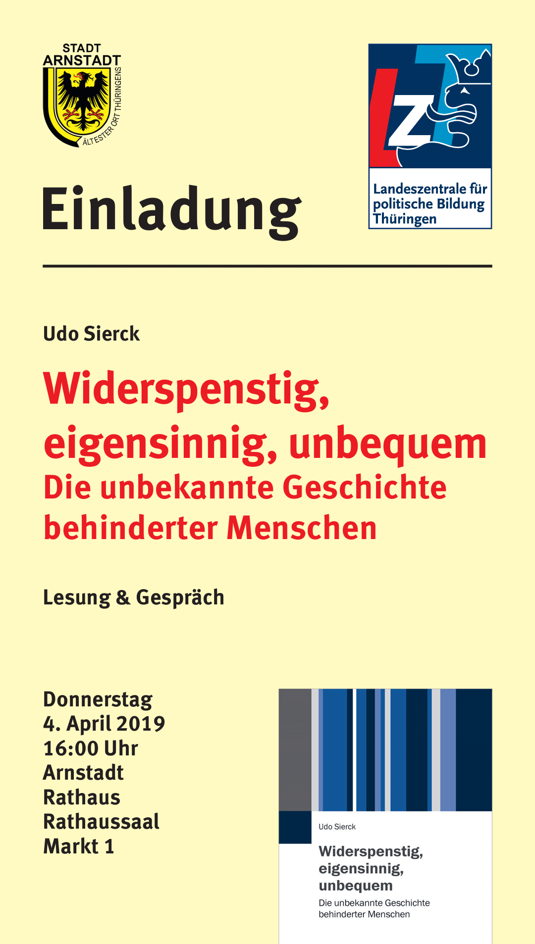 Die Landeszentrale für politische Bildung Thüringen sowie die Stadtverwaltung Arnstadt, Gleichstellungs- und Behindertenbeauftragte laden zu dieser spannenden Buchlesung in den Saal des Arnstädter Rathauses recht herzlich ein. Der barrierefreie Zugang für mobilitätsbehinderte Gäste ist über den Rathaus-haupteingang und per Aufzug gegeben, die mobile Hörsäule ermöglicht für Menschen mit Hörgeräten eine klare Akustik und eine Gebädensprach-dolmetscherin steht für gehörlose Besucher zur Übersetzung in Deutsche Gebärdensprache bereit. EINTRITT FREI !