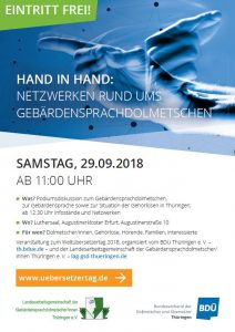 „Hand in Hand- Netzwerken rund ums Gebärdensprachdolmetschen“ ist die Losung unseres Podiums, zu dem wir uns besonders auf unsere Netzwerkpartner, die wir als Podiumsgäste geladen haben freuen: eine taube Gebärdensprachdolmetscherin, eine Pädagogin die im bilingual-bimodalen Schulversuch an der Thüringer Gemeinschaftsschule Am Roten Berg unterrichtet sowie einem/r Vertreter/in des Landesverbandes der Gehörlosen Thüringen e.V. So ist ein breites Spektrum an Wissen, Qualifikationen, Ressourcen und Erfahrungen vertreten, mit dem wir eine große interessierte Öffentlichkeit erreichen und informieren können.